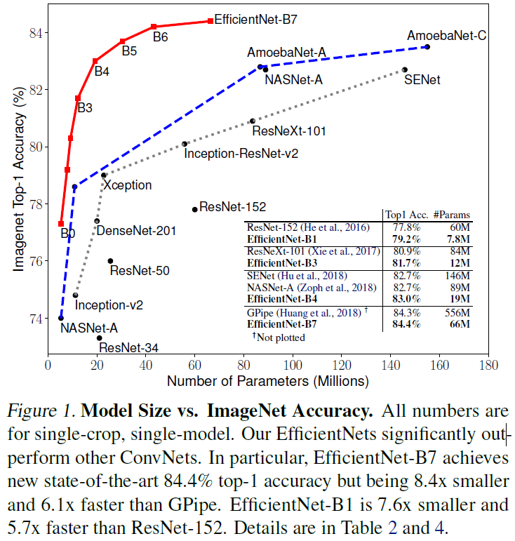 - 모델의 Depth(레이어 수), Width(conv layer의 채널 수), Resolution(입력 영상 크기)를 모델의 크기를 결정하는 하이퍼파라미터로 보고, 제한된 크기에 따라 효과적인 모델을 찾아냄